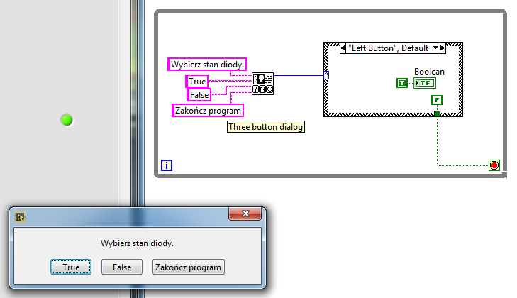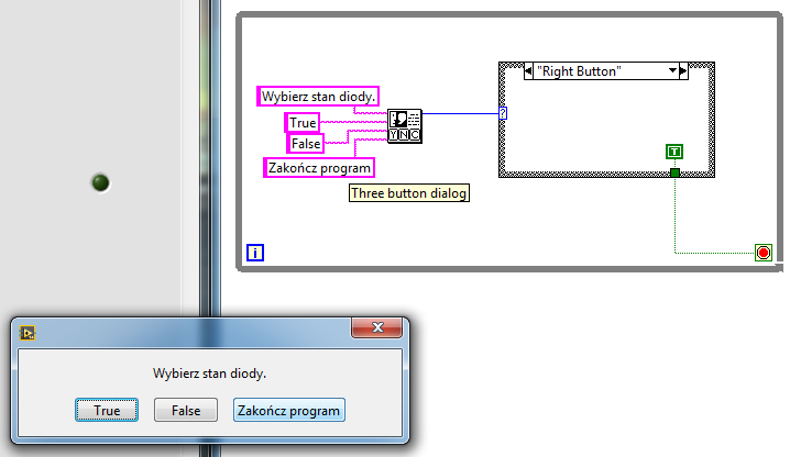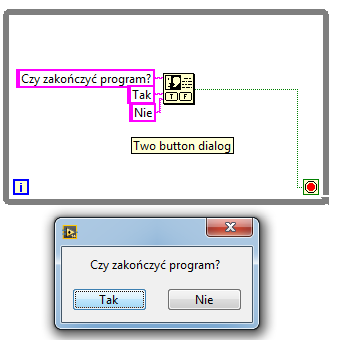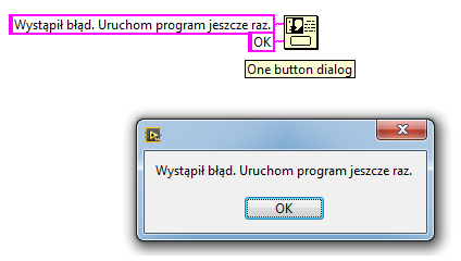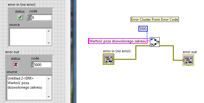 W LabVIEW zarówno błędy jak i ostrzeżenia są przekazywane w formie klastra, który składa się z trzech elementów: