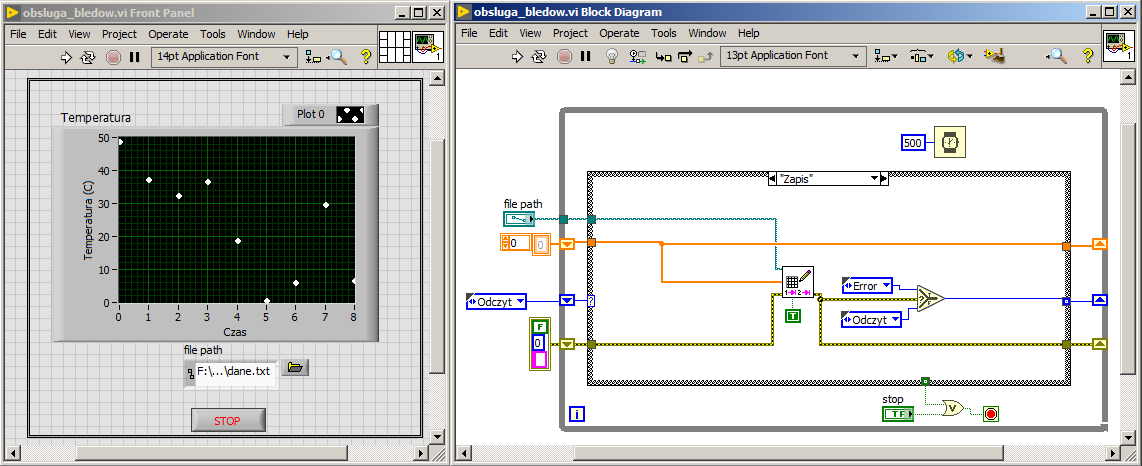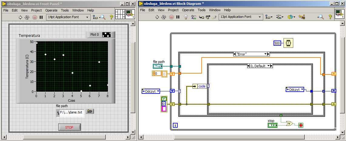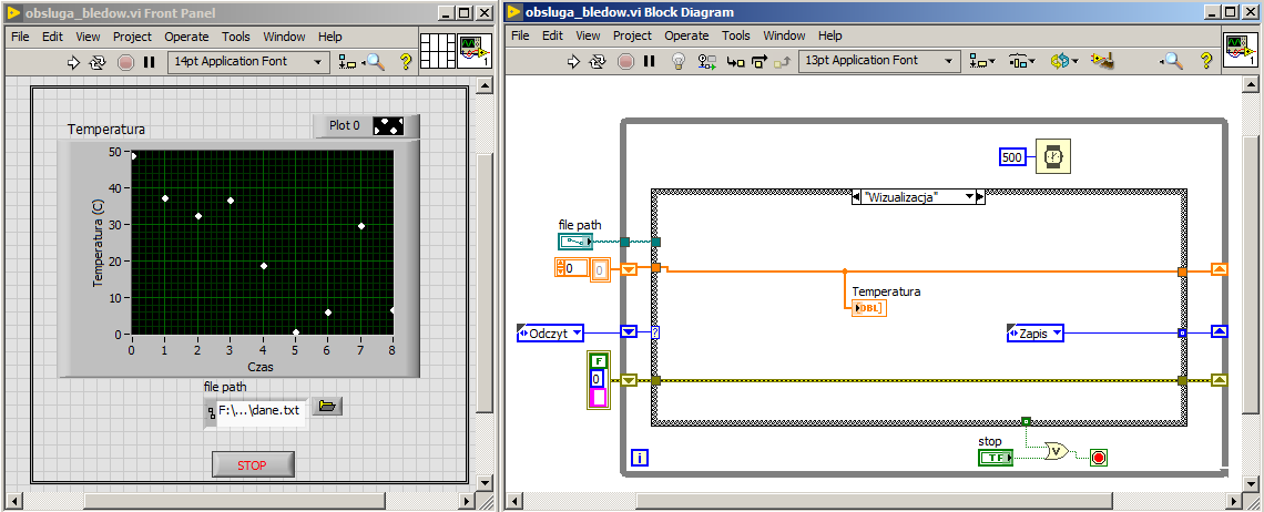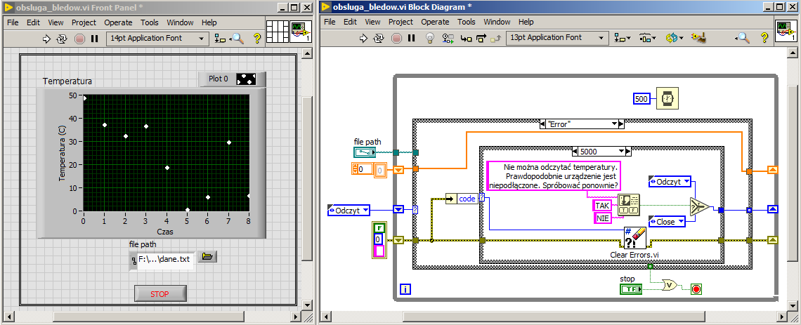 Poniżej przedstawiono przykładowy program, który odczytuje temperaturę z czujnika, wyświetla ją na wykresie oraz zapisuje do pliku. Dodano tutaj własny błąd związany z problemem odczytu temperatury o kodzie 5000. Ponadto przechwycono błąd związany z podaniem nieprawidłowej ścieżki do pliku (kod 43). Komunikację z użytkownikiem rozwiązano korzystając z two button dialog.